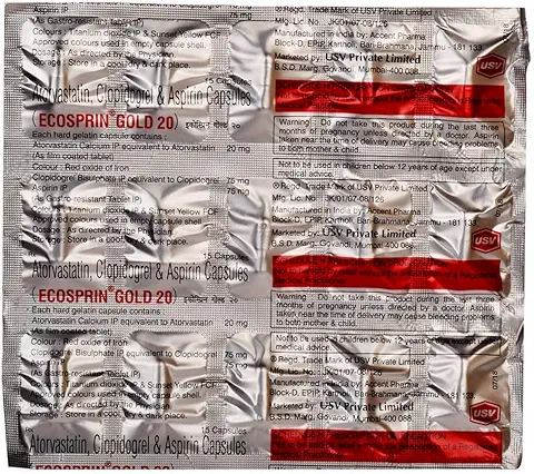 Ecosprin Gold 20 Capsule is composed of three medicines namely: Atorvastatin (lipid or cholesterol-lowering medicine), Aspirin (analgesic and anticoagulant) and Clopidogrel (anticoagulant). Together they help in lowering increased bad cholesterol (low-density lipoprotein – LDL) and raise good cholesterol (high-density lipoprotein – HDL). This, in turn, prevents the formation of blood clots and plaque (cholesterol) deposited in the walls of heart arteries thereby minimizing the risk of cardiovascular heart diseases like heart attack and stroke.